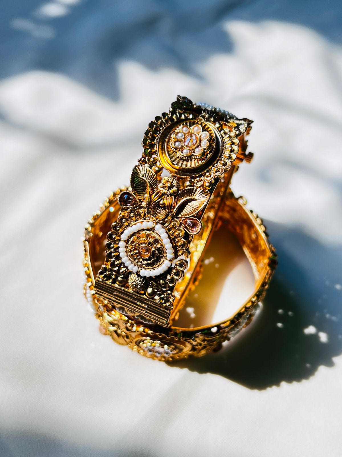 Elevate every gesture with this heirloom‑inspired statement bangle—where intricate hand‑woven metalwork meets the soft glow of pearls and Kundan stones.