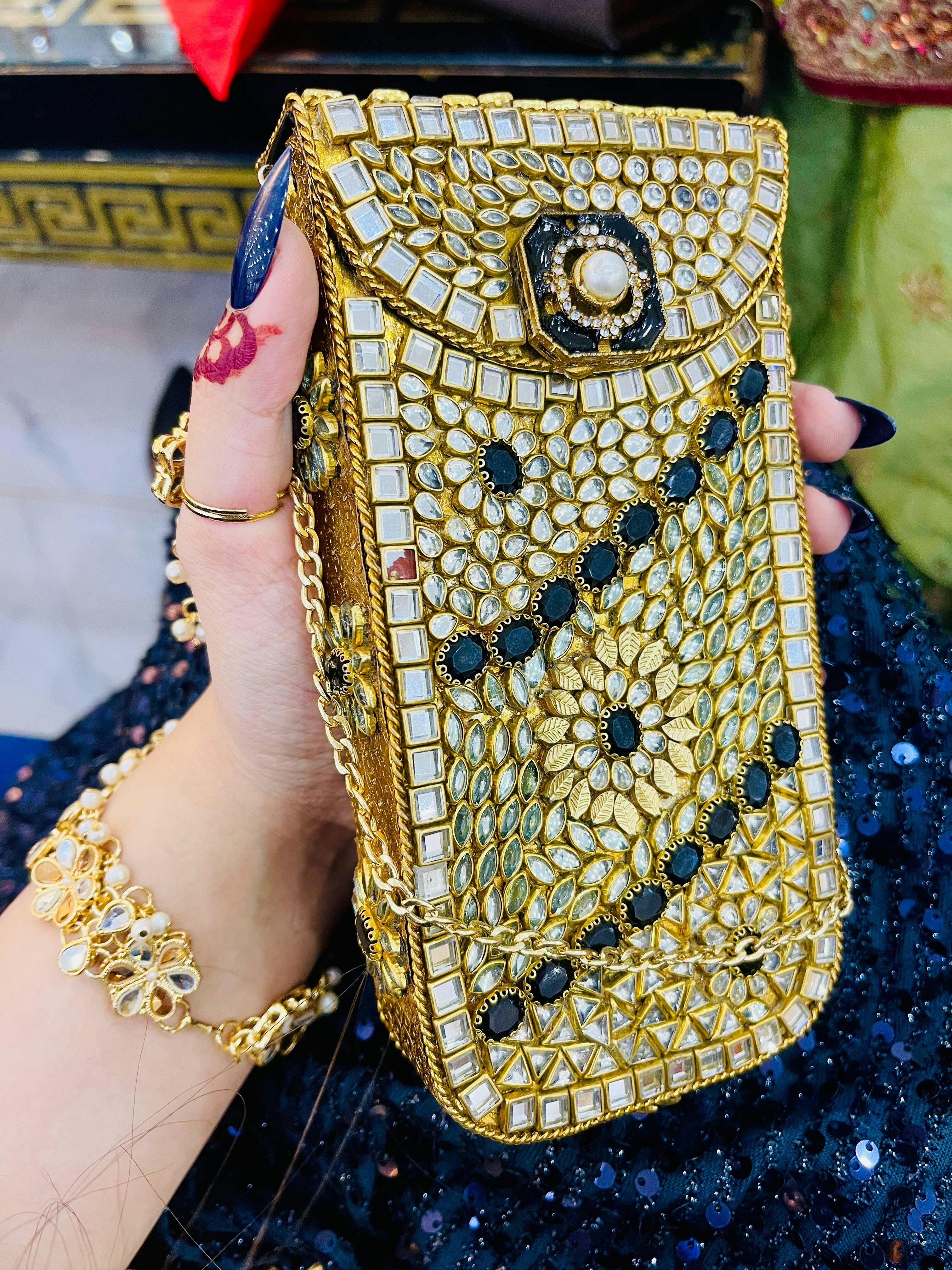 Kundan long mobile fit clutch real red stones