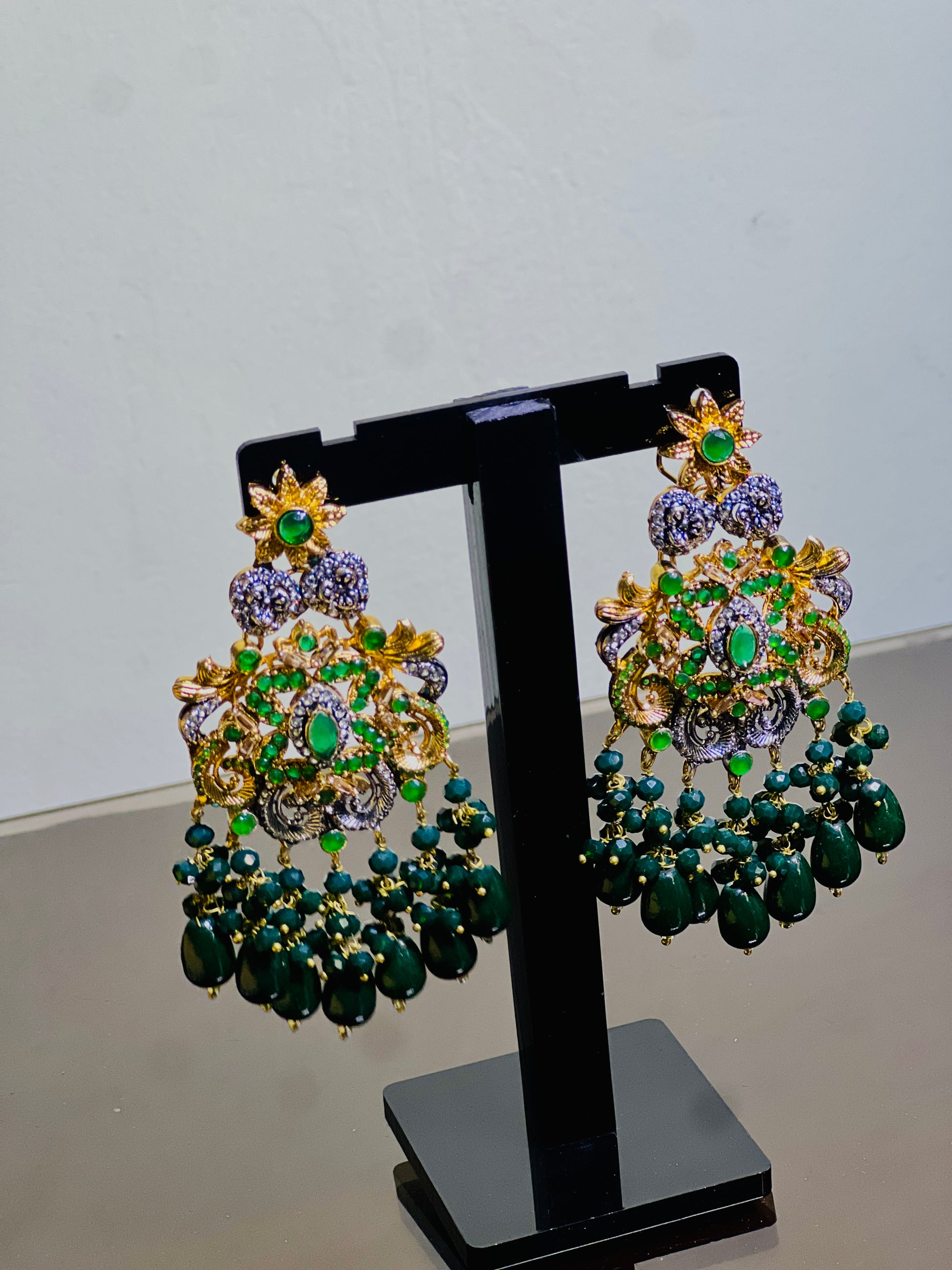 Turn heads with our Regal Emerald Chandelier Earrings, a luxurious blend of tradition and modern elegance. These stunning earrings feature an intricate floral design with a radiant gold-tone base, accented by sparkling white stones, vibrant green crystals, and deep green teardrop beads. Perfect for weddings, festive occasions, or a glamorous evening out, these earrings are a statement piece that adds royal charm to any outfit.